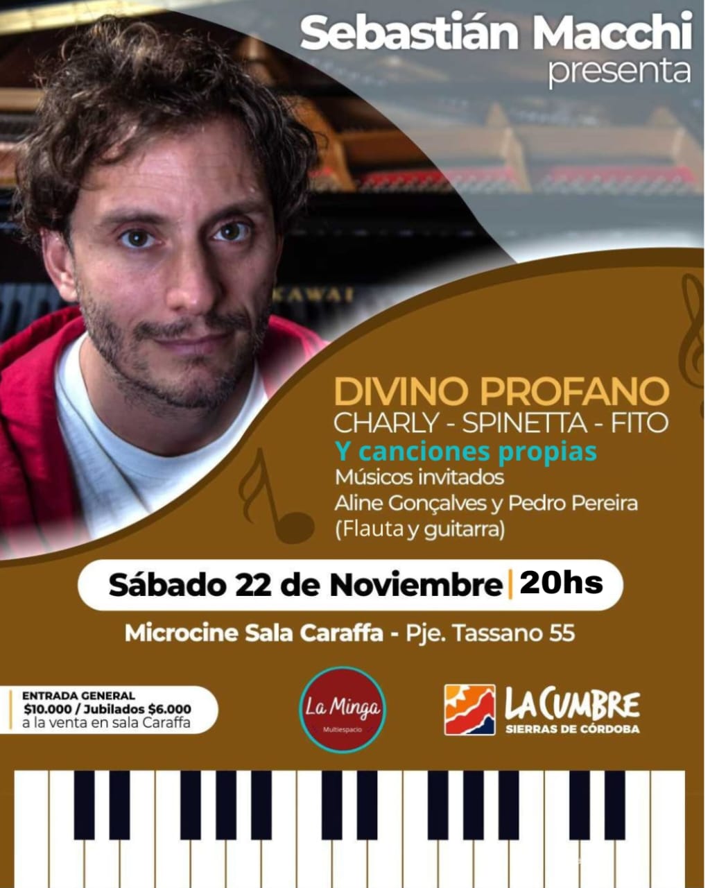 🎹 Sebastián Macchi presenta “Divino Profano” Un recorrido musical por el universo de Charly, Spinetta y Fito, junto a composiciones propias llenas de sensibilidad y fuerza. ✨ Con la participación especial del dúo brasilero Aline Gonçalves y Pedro Pereira (flauta y guitarra). 🗓 Sábado 22 de noviembre | 20 hs 📍 Microcine Sala Caraffa – Pje. Tassano 55 🎟 Entradas:…