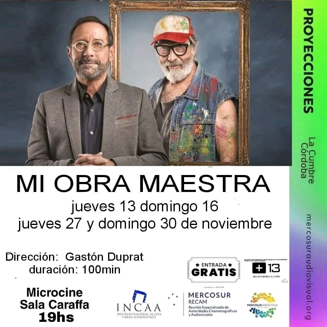 🎬 MI OBRA MAESTRA 📅 Jueves 13, domingo 16, jueves 27 y domingo 30 de noviembre 🕖 19 hs 📍 Microcine Sala Caraffa 🎟️ Entrada gratuita 👥 Apta para mayores de 13 años 🎬 Dirección: Gastón Duprat ⏱️ Duración: 100 minutos Sinopsis: Arturo es un galerista encantador y sofisticado, mientras que Renzo es un pintor hosco y en decadencia. Aunque…